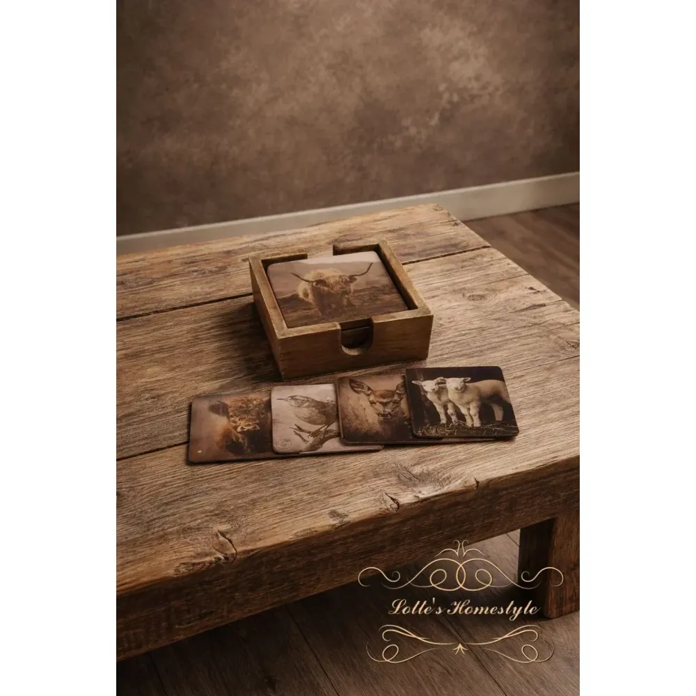 Op de onderzetters staan verschillende dierenafbeeldingen, zoals een bison, wat zorgt voor een natuurlijke en robuuste uitstraling. De set wordt geleverd met een bijpassende houder, zodat je de onderzetters netjes bij elkaar kunt opbergen wanneer ze niet worden gebruikt.